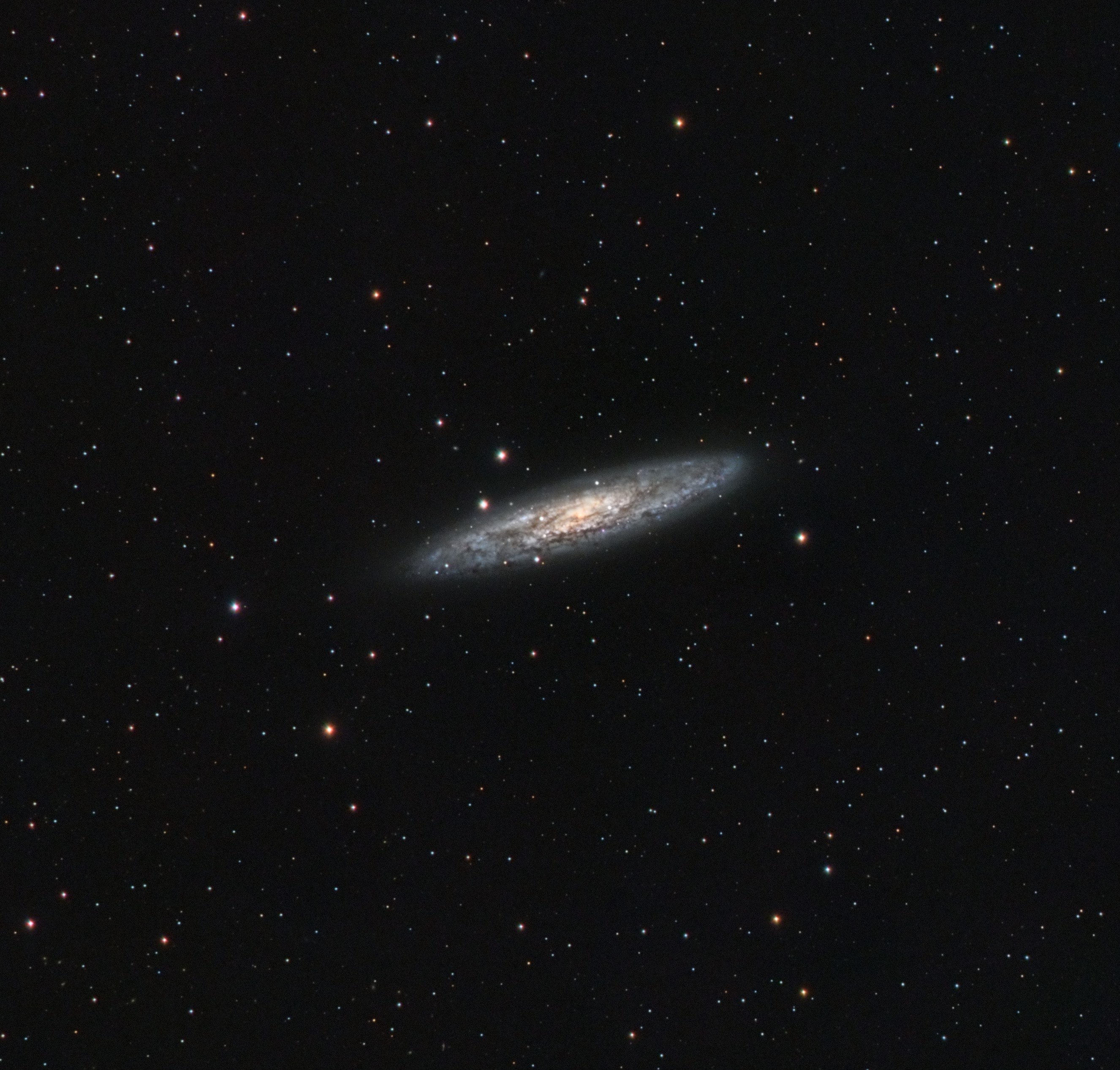 NGC 253 or often called the Silver Dollar Galaxy is dominated by it's dust patterns. Discovered by Caroline Herschel in 1783, it is one of the brighter galaxies visible. NGC 253 is a member of the Sculptor Group of galaxies, one of the nearer galaxy groups. Only one supernova has been detected in NGC 253 so far.